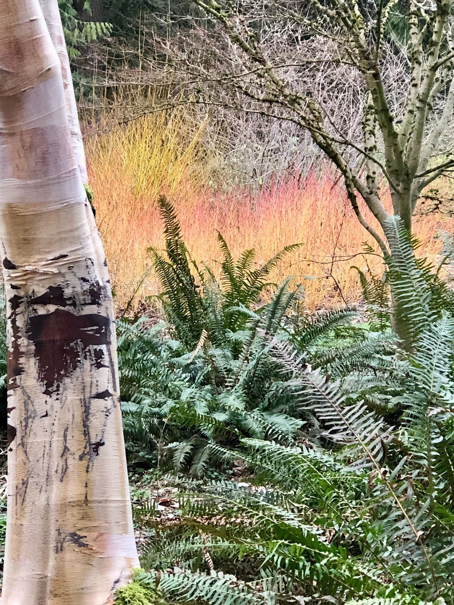 “Midwinter Fire” Dogwood brightens up the backdrop for a birch and ferns in the Winter Garden at the Washington Park Arboretum. Author photo.