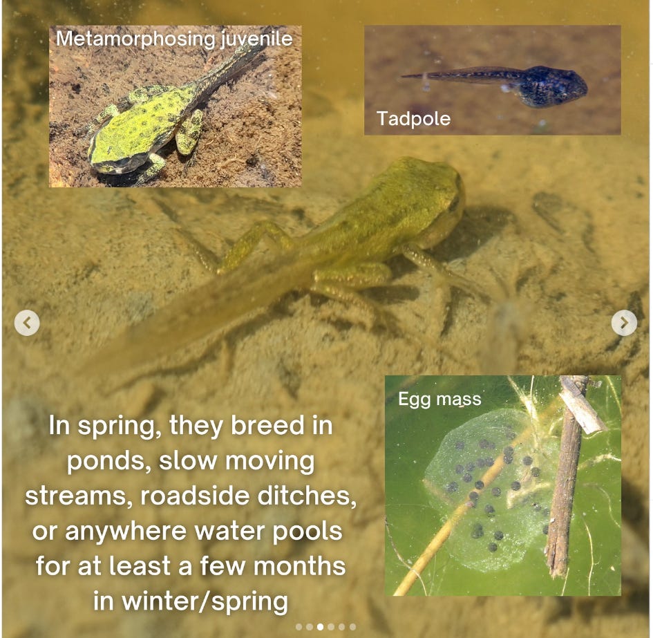 After spending the winter tucked away beneath leaf litter, logs, or loose soil, Pacific chorus frogs emerge with the return of longer days and warmer rains. During the colder months, they enter a state called brumation which is similar to hibernation, but for cold-blooded animals. Their bodies slow dramatically, their heart rates drop, and they rely on stored energy to survive until spring. In especially harsh conditions, these frogs have an almost magical ability: they can tolerate partial freezing, their bodies protected by natural antifreeze-like compounds. Specifically, for the nerdy among us, its high concentrations of glucose and glycerol that prevents them from succumbing to the freeze. This cryoprotection allows them to freeze solid, stopping their heart and breathing, then thaw and fully recover when temperatures rise.