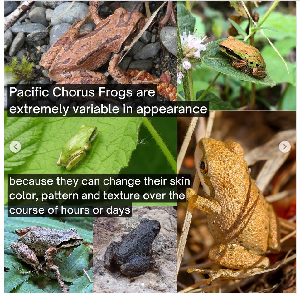 What makes them especially delightful to identify is their remarkable range of colors. While many are shades of green or brown, some individuals carry a reddish hue, and patterns can vary widely from frog to frog. This diversity is shaped in part by genetics. Studies have shown that multiple genes influence coloration, with brown tending to be dominant and red more recessive, but the story doesn’t end there. Pacific chorus frogs are also capable of shifting between green and brown depending on their surroundings, blending into leaves, mud, or bark with subtle ease. In this way, they are both constant and changing, a small, living reflection of the adaptable, ever-shifting landscapes they call home. If you’re not sure, look out for that eye stripe originating from just above the nostril and extending toward the front legs. That’s a diagnostic feature!