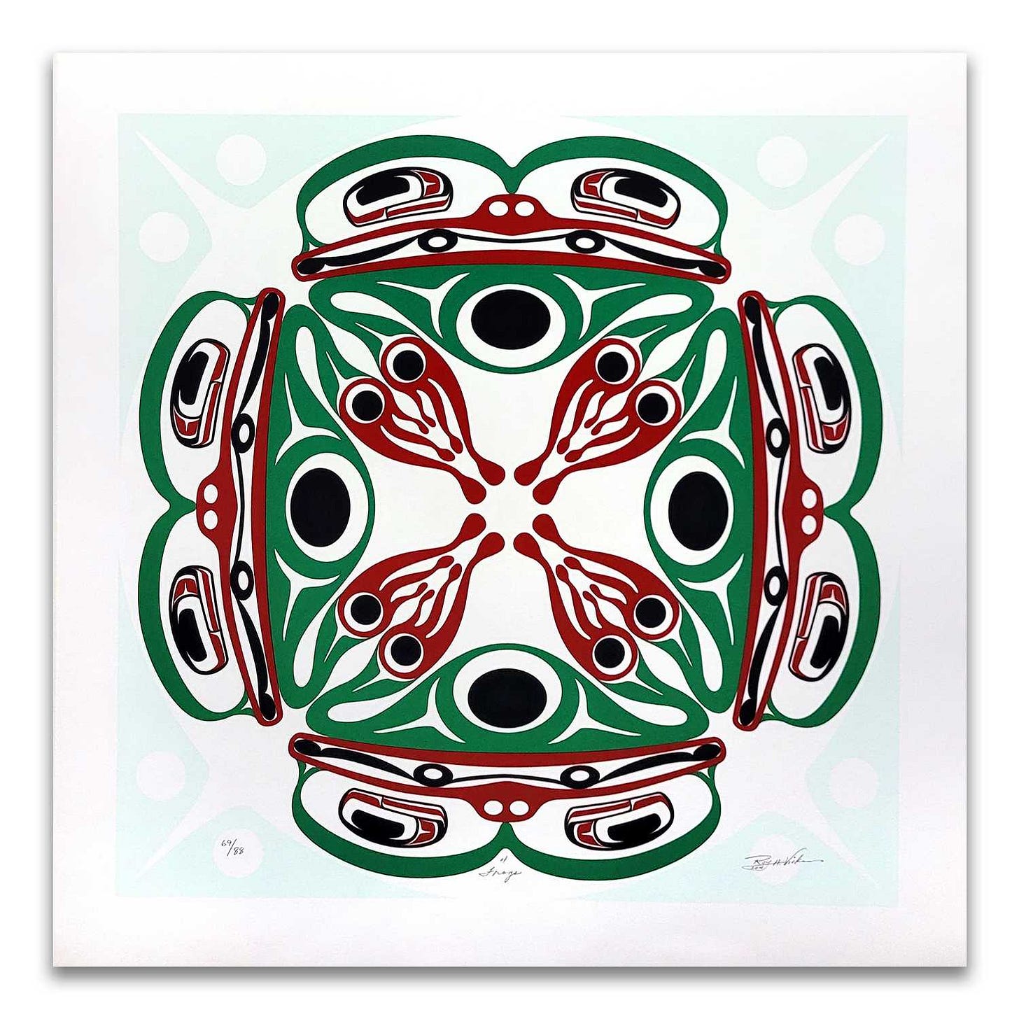 Many Frogs, Hand-pulled screen print, 2014 by Roy Henry Vickers from BC’s Tsimshian Nation along the Pacific Northwest Coast. From the artist’s statement, “The frog is a powerful symbol of transformation for the Gitxsan people of the Skeena valley and has been a clan crest for thousands of years. There are dances and songs that belong to those people of the frog clan. One day I was inspired by some people of the frog clan to create this design for a large drum.”